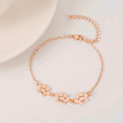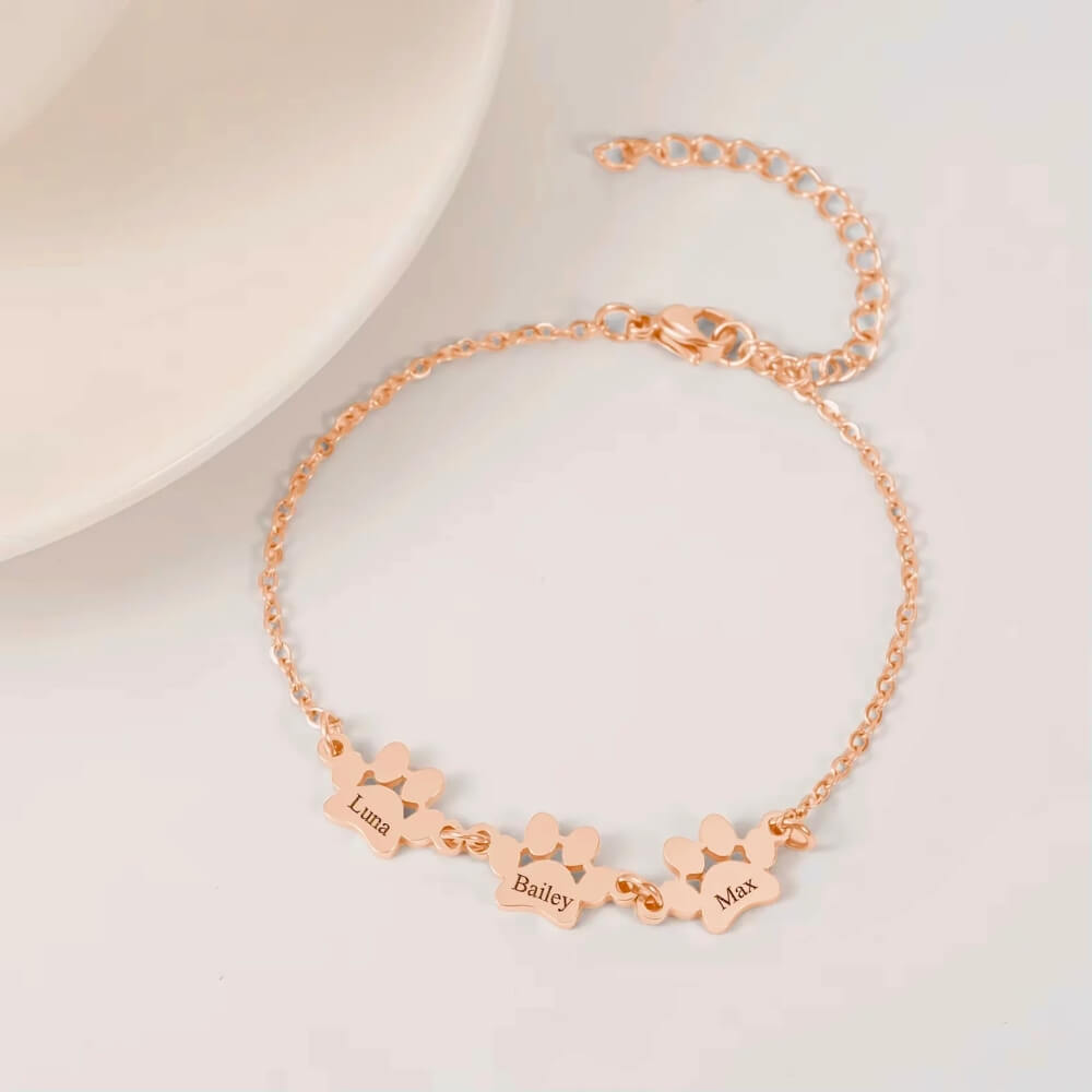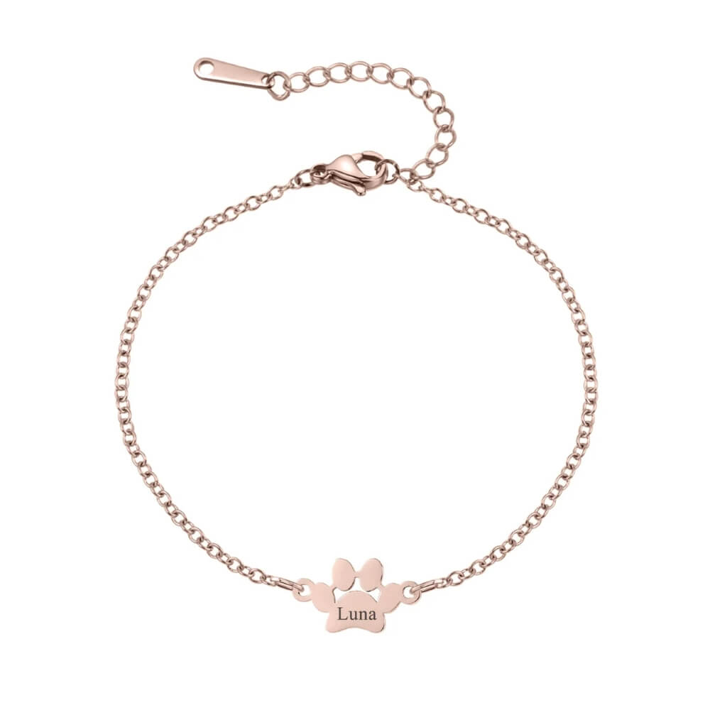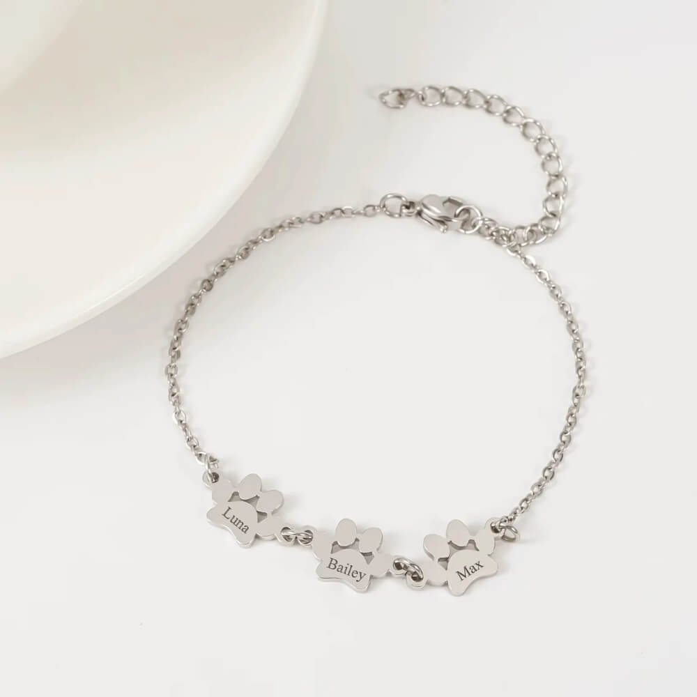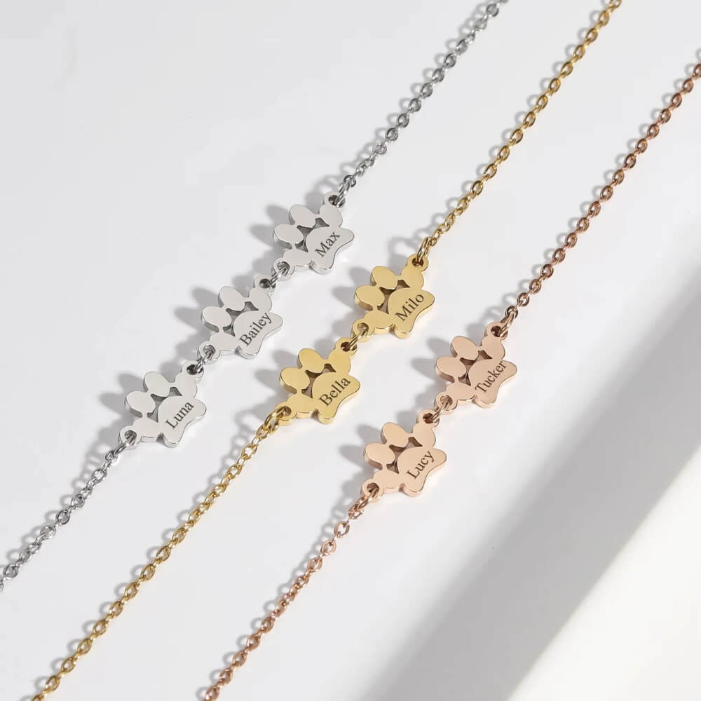 During checkout, you can enter your pet’s name and select the desired color ( silver, gold, or rose gold). We’ll engrave it alongside a cute paw print design for a unique, personalized bracelet.